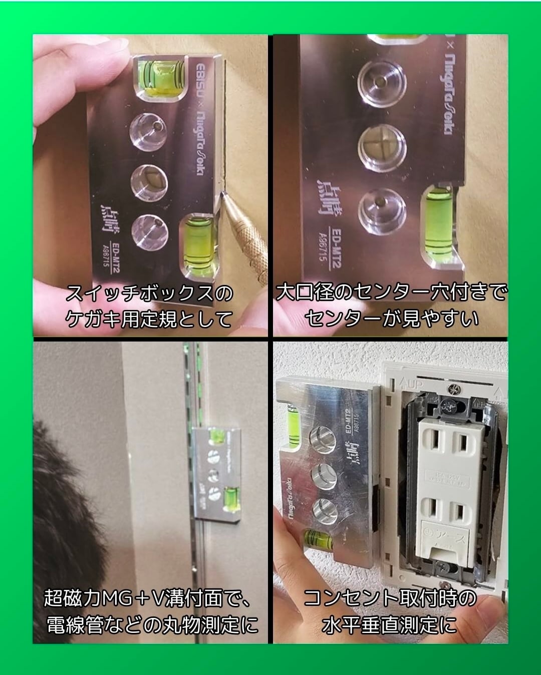 ●埋込式スイッチボックスやコンセント取付時の水平垂直測定に便利です。