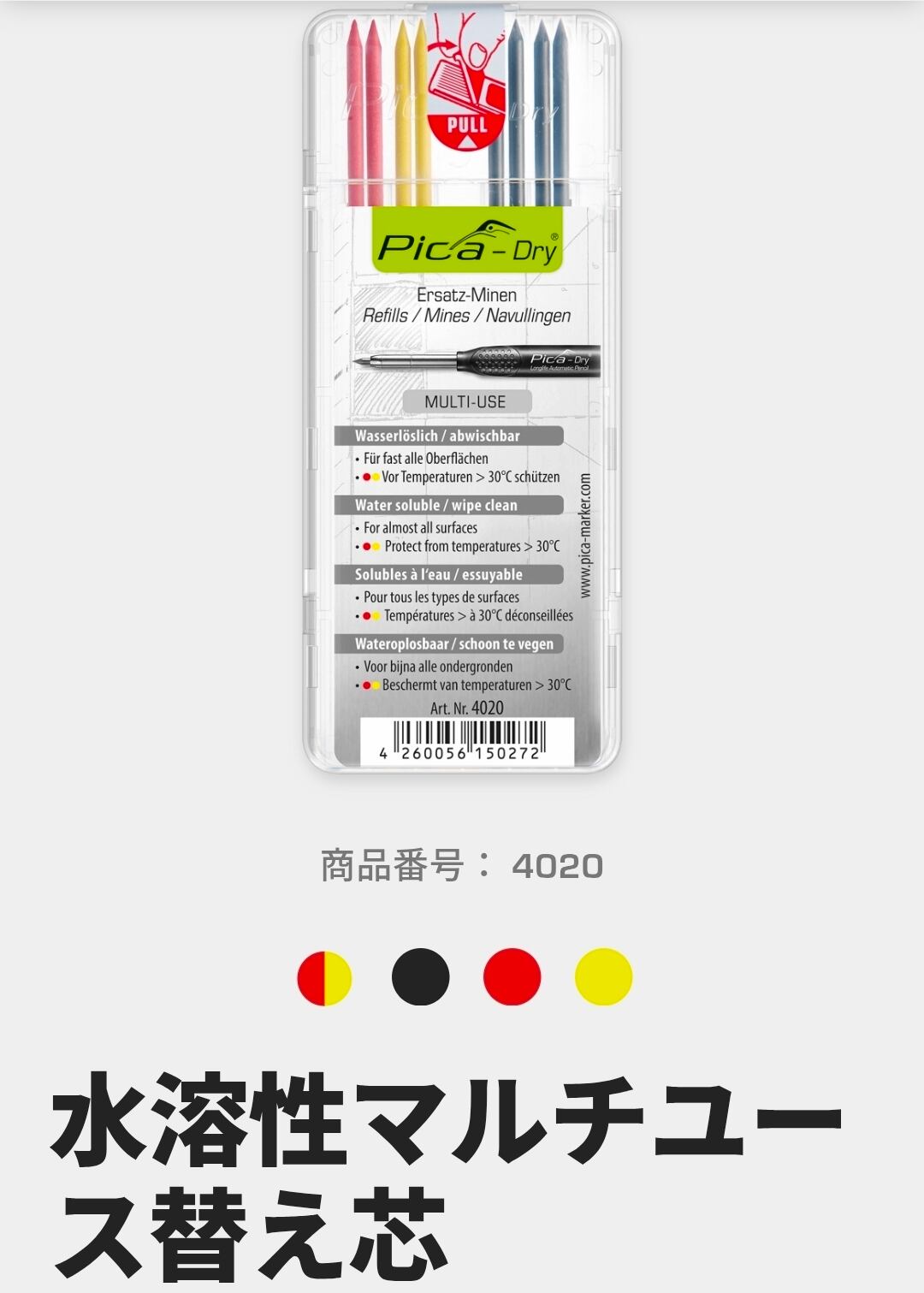 水溶性で、さまざまな表面に適している。滑らかな表面は湿らせた布で拭き取ることができ、赤と黄は30℃までの温度を保ってください。