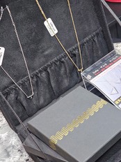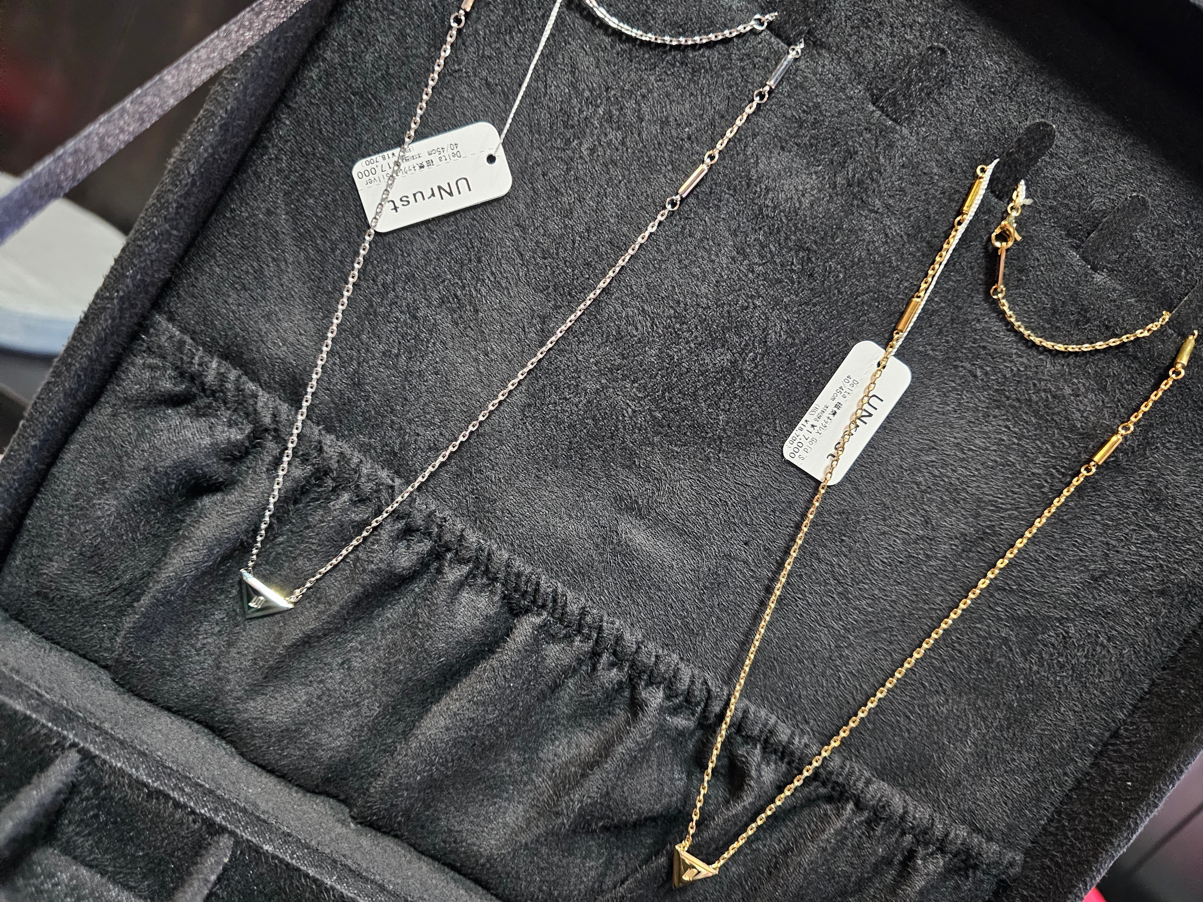 三角モチーフのトップと細身チェーンの組み合わせで、シルバー・ゴールドどちらもすっきりとした印象に。
